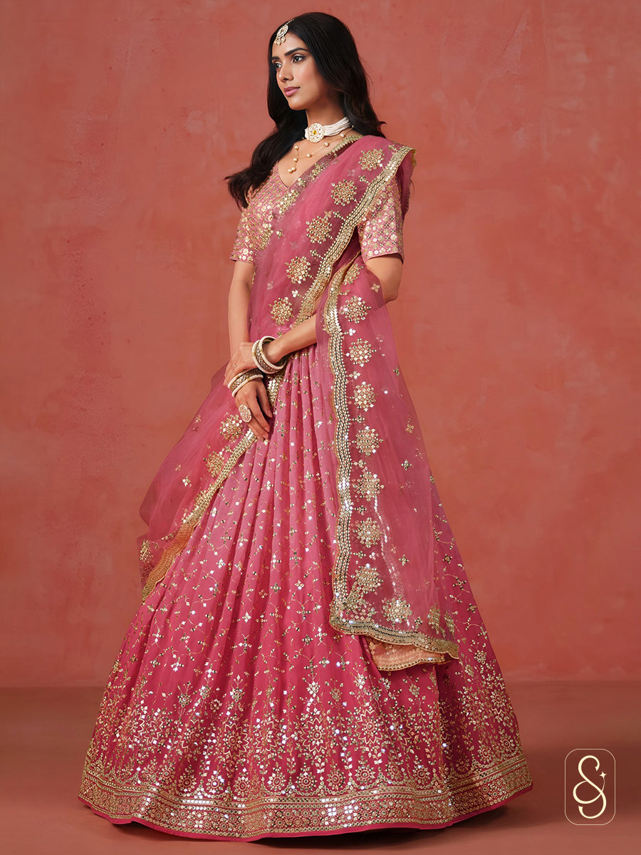This stunning shaded pink lehenga set from Silk and Sparkle is designed to bring a soft yet glamorous charm to your festive wardrobe. Adorned with intricate zari and sequence embroidery, the ensemble beautifully highlights detailed craftsmanship with a graceful tonal effect. The delicate net dupatta adds an airy and elegant finish, while the blouse is tailored to provide a comfortable and flattering fit from small to 4XL, making it perfect for celebrations and special occasions.