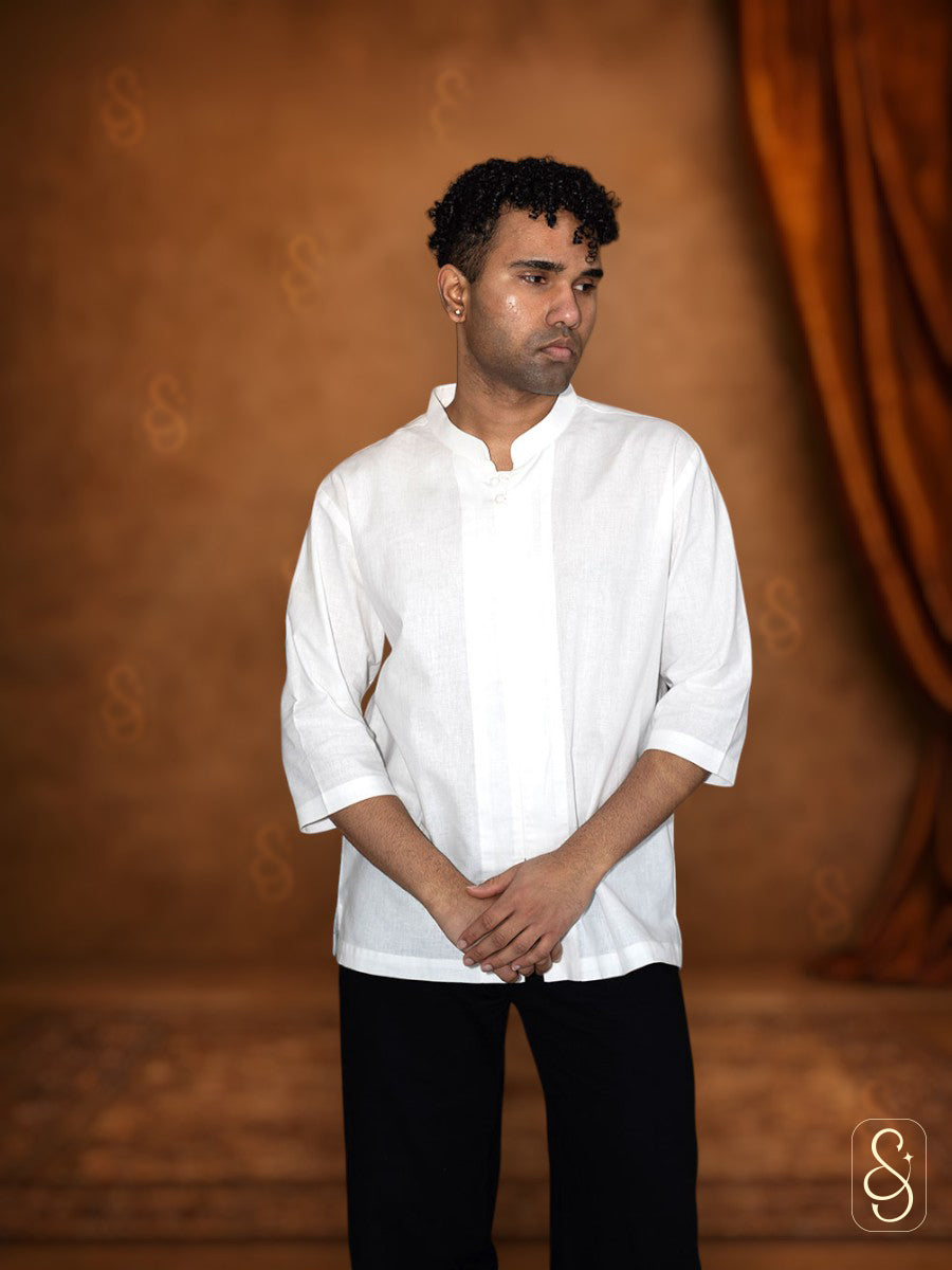 This pure white cotton linen shirt for men offers a perfect blend of comfort and sophistication. As it is crafted from breathable fabric, it ensures ease of wear while maintaining a crisp and refined look. The shirt is ideal for both casual outings and formal gatherings and never goes out of style.