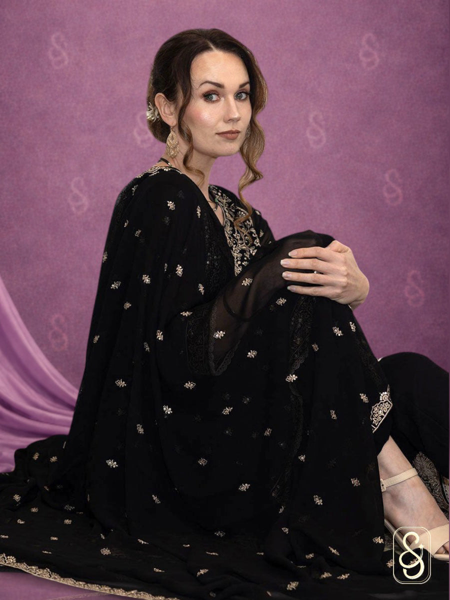 This elegant pant suit is crafted from lightweight georgette fabric and adorned with fine embroidery for a refined look. It comes with a matching dupatta that adds a touch of grace, making it a perfect choice for festive occasions, parties, and traditional gatherings.