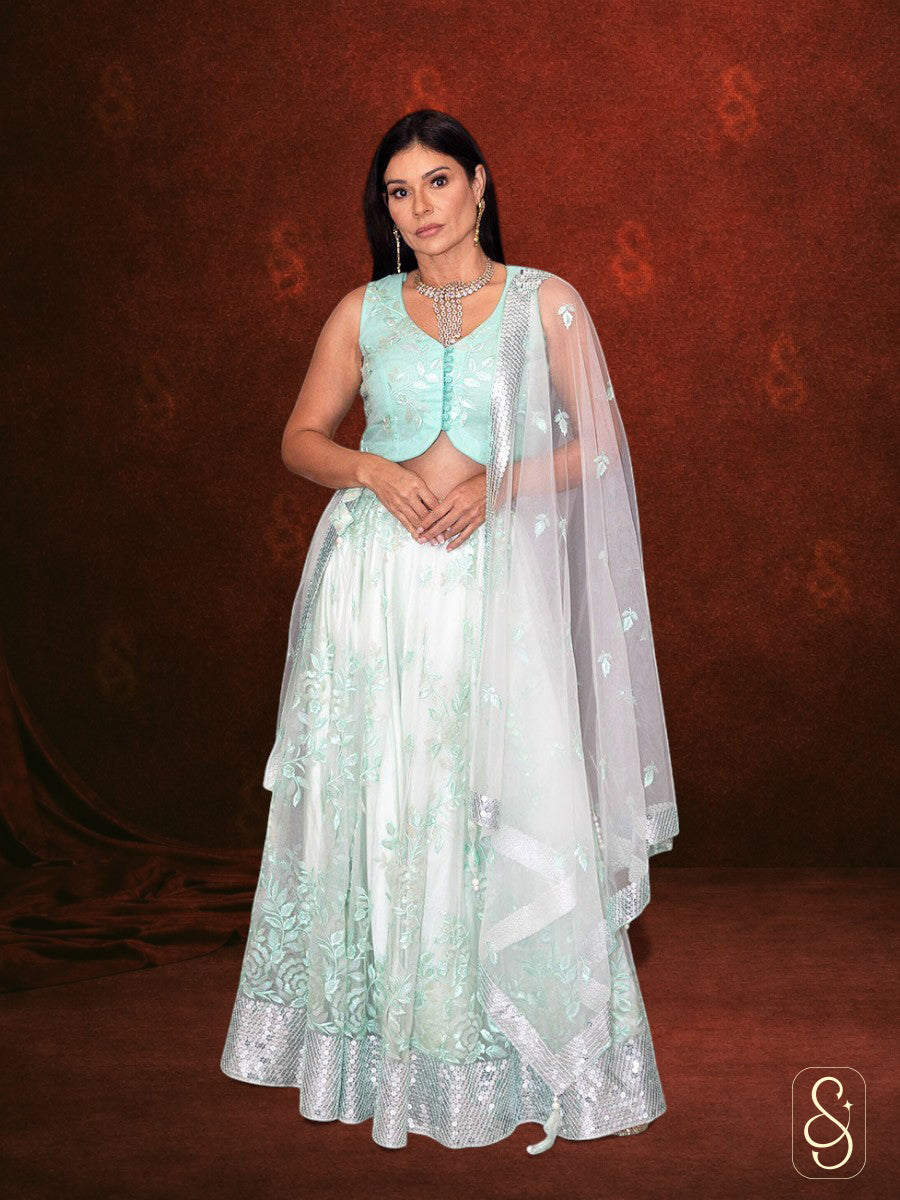 Dazzle at your next event with this stunning Silk and Sparkle lehenga set. The vibrant green net lehenga, blouse, and dupatta all feature exquisite sequence embroidery. This complete ensemble captures light from every angle, promising a glamorous and unforgettable appearance for your most special occasions.