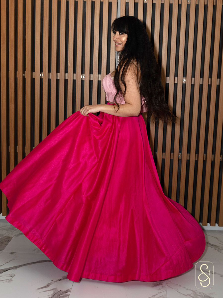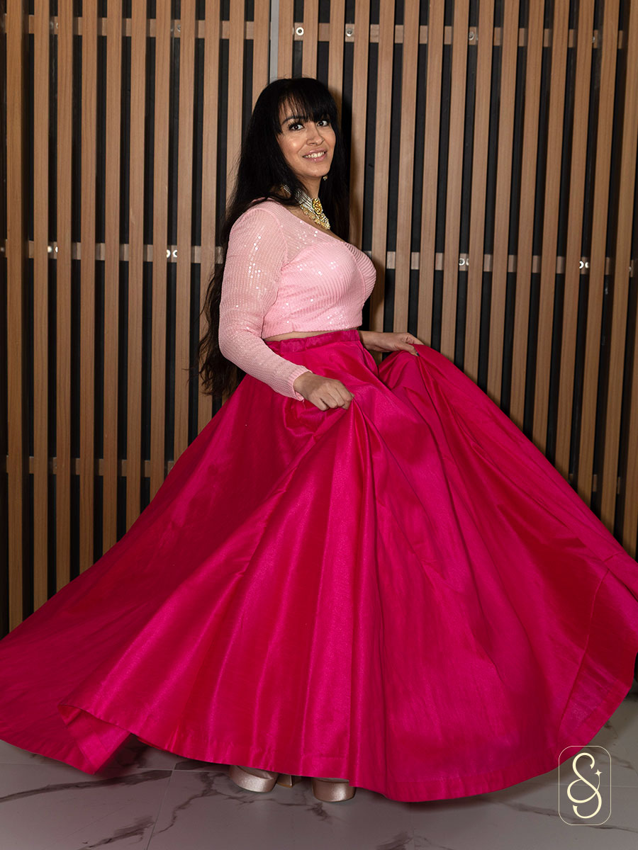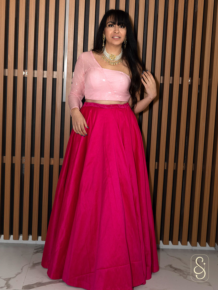 This vibrant hot pink flared skirt pairs beautifully with a one-shoulder sequin blouse and creates a striking and fashionable look. An optional dupatta is available to add versatility and elegance to the outfit. The dress is perfect for weddings, parties, or festive occasions, as it combines bold style with graceful charm.
