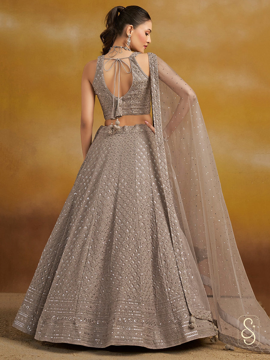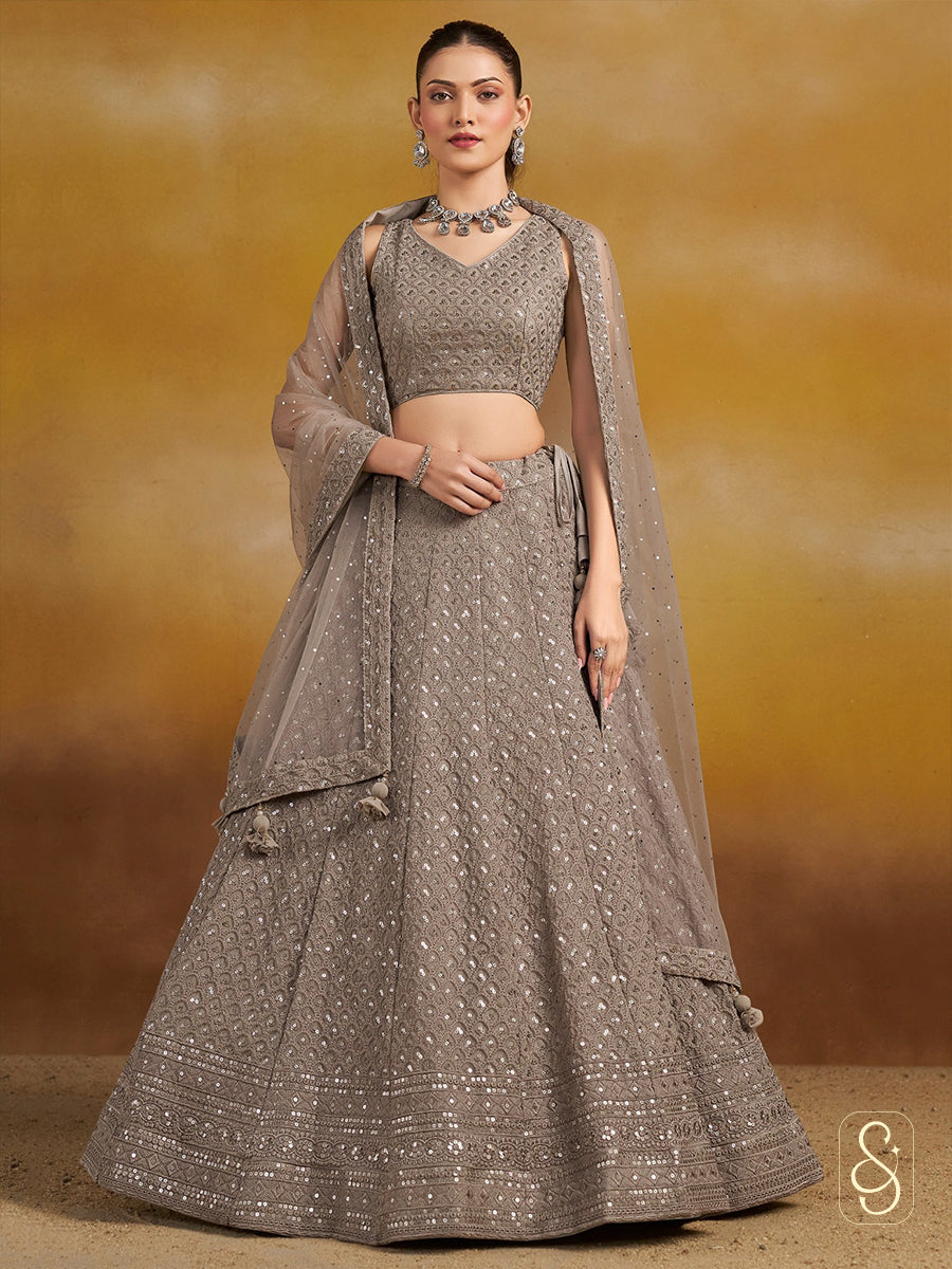 This sophisticated mouse-coloured lehenga set from Silk and Sparkle is designed to offer understated elegance with a festive sparkle. Crafted in flowy georgette fabric with intricate thread and sequence embroidery, the ensemble beautifully blends subtle tones with detailed craftsmanship. The soft net dupatta adds a graceful finish, while the blouse is tailored to provide a comfortable and flattering fit from small to 4XL, making it perfect for a variety of special occasions.