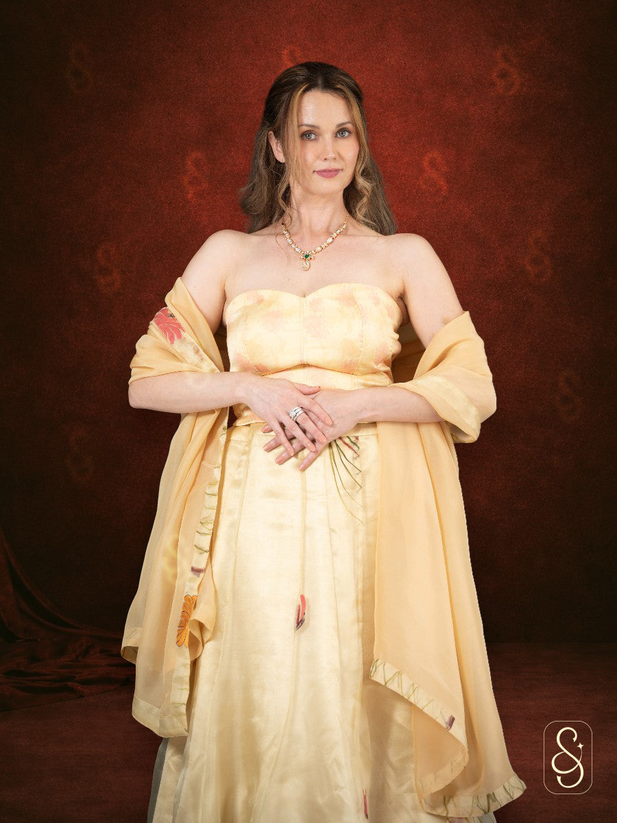 Stylish organza tissue printed lehenga paired with a structured corset blouse and a sheer organza dupatta, creating a modern yet elegant look for festive occasions and celebrations.
