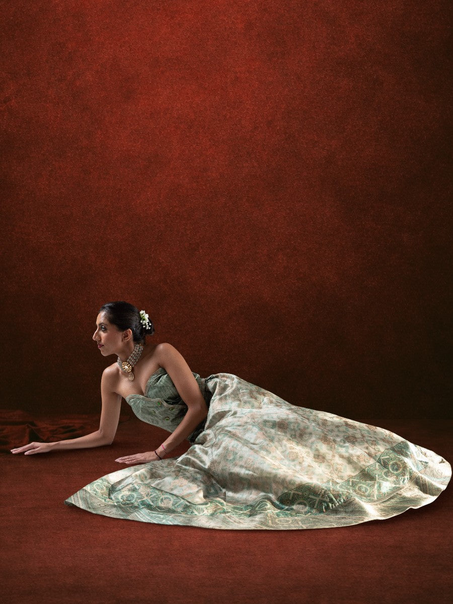 Make a striking statement in this Silk and Sparkle lehenga set. The golden printed tissue organza lehenga sculpts a glamorous fish cut silhouette. This ensemble creates a stunning contrast with its rich green raw silk embroidered blouse and an airy organza dupatta to ensure a bold, memorable impression.