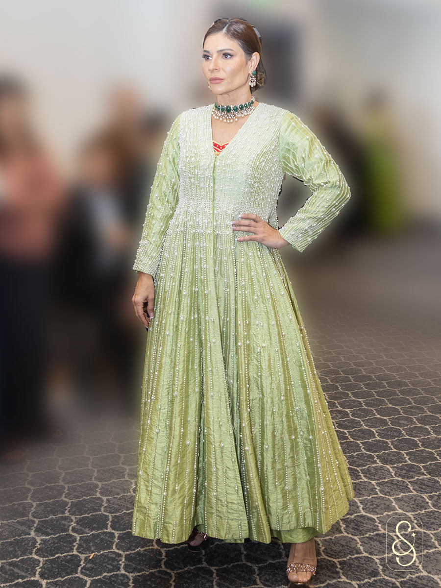 Step into luxury with this stunning raw silk jacket set. The beautifully crafted jacket features heavy pearl work that adds a glamorous touch, paired with elegant pants for a complete look. This versatile outfit works wonderfully for cocktail parties, receptions, and upscale gatherings where you want to make a sophisticated impression with effortless style.