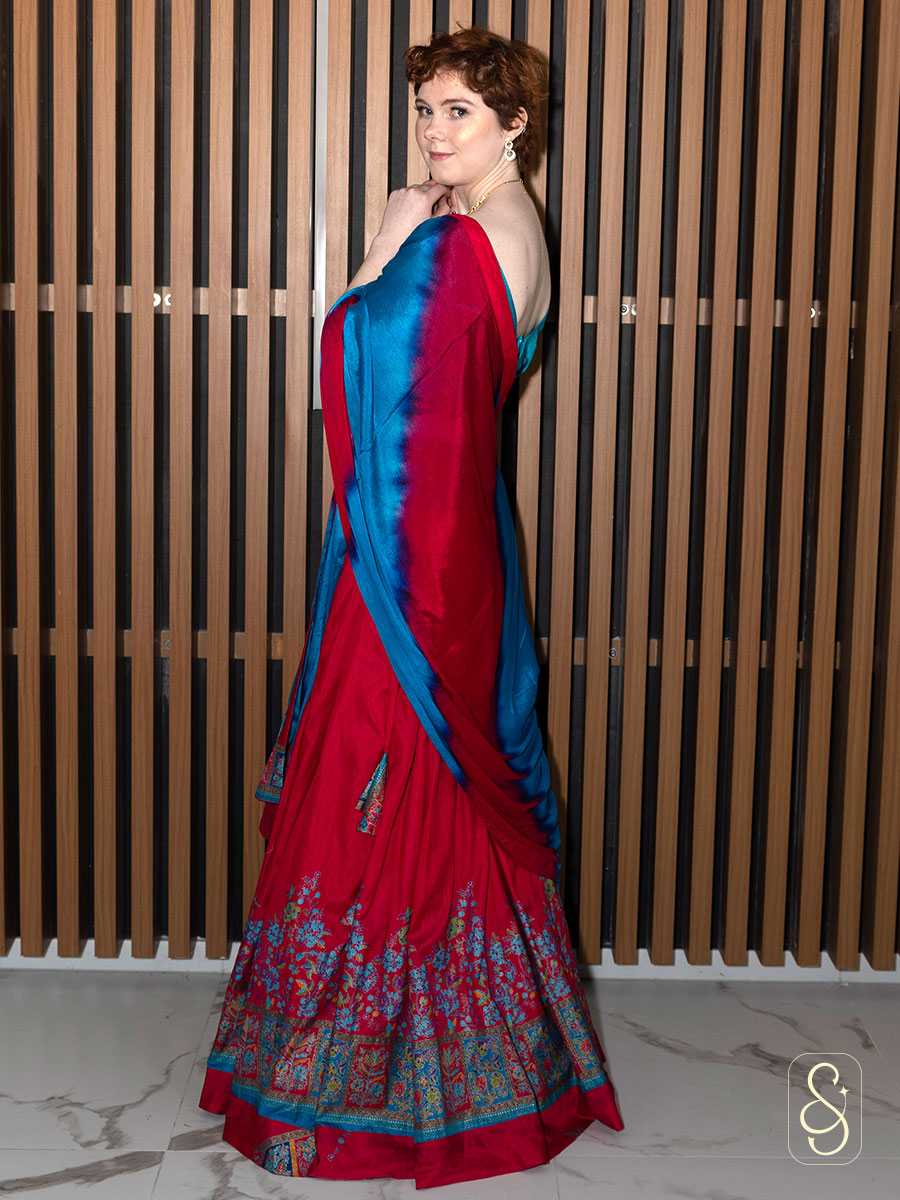 This elegant silk block print lehenga is paired with an embroidered raw silk blouse and a delicate organza dupatta. The rich textures and intricate detailing create a perfect harmony of tradition and modern style. the ensemble is ideal for weddings, festive gatherings, or cultural celebrations.