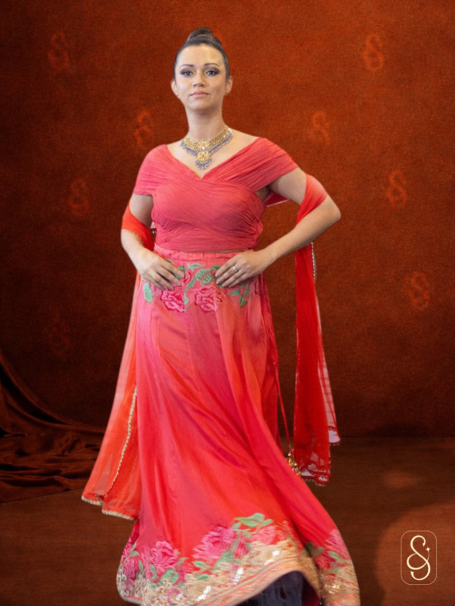 Enjoy versatile styling with this beautiful soft silk lehenga from Silk and Sparkle. The cross stitch embroidery adds intricate detailing, while the trendy ruched blouse creates a modern look. Wear it traditionally with the chinon dupatta for weddings and festivals, or skip the dupatta for a chic indo-western style perfect for cocktail parties and receptions.