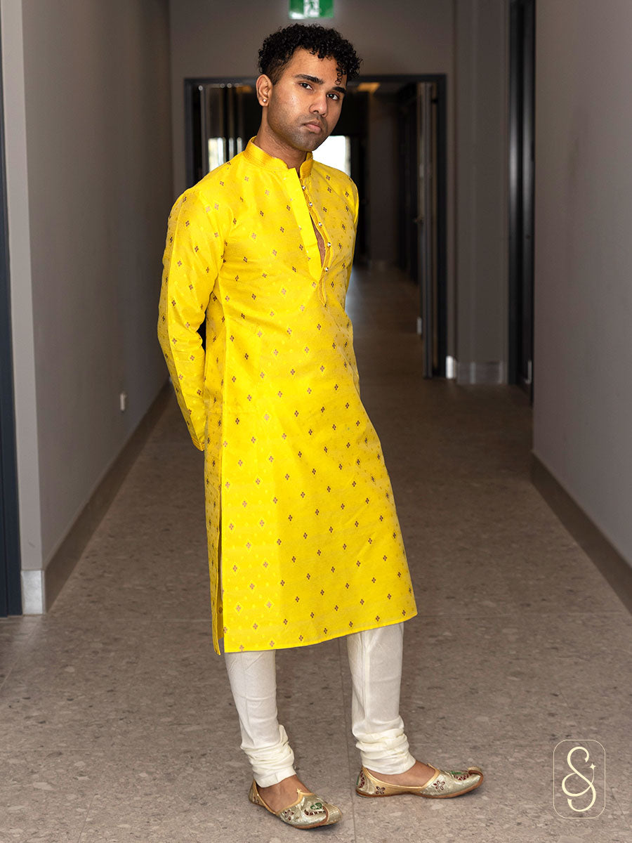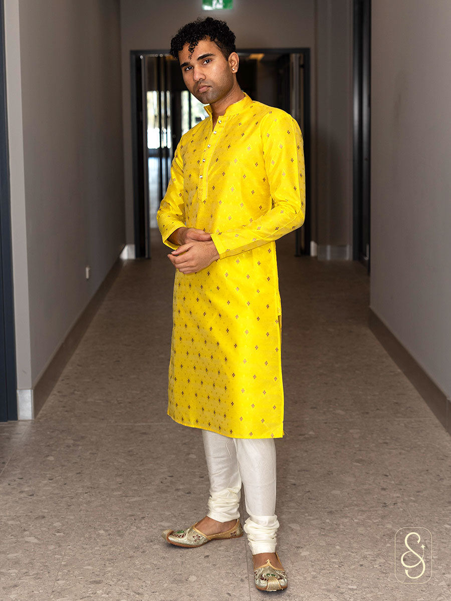 Choose traditional elegance with this Silk and Sparkle men's kurta set. The vibrant yellow brocade features unique variations in its buti print, giving each piece its own character. This ensemble ensures a sharp, classic silhouette with its traditional churidar. Available in sizes 36/38/40.