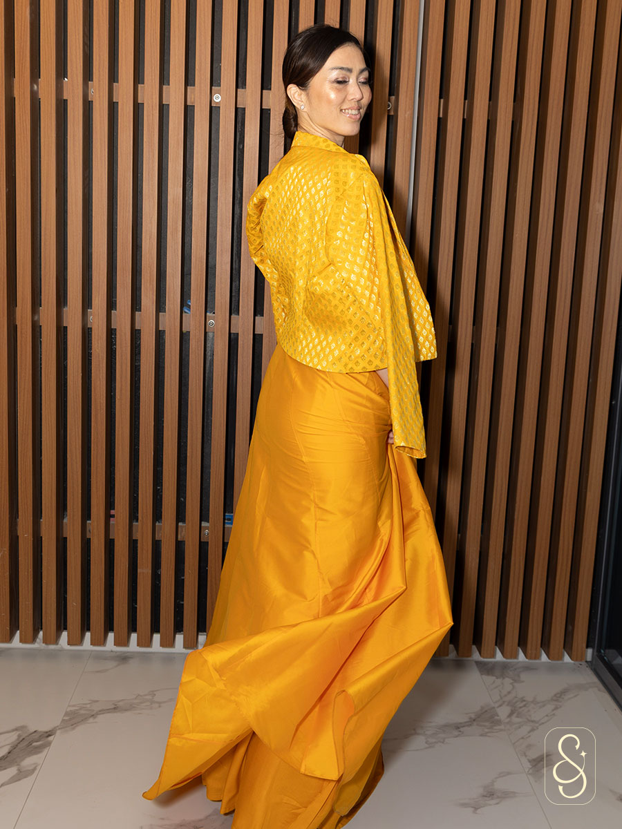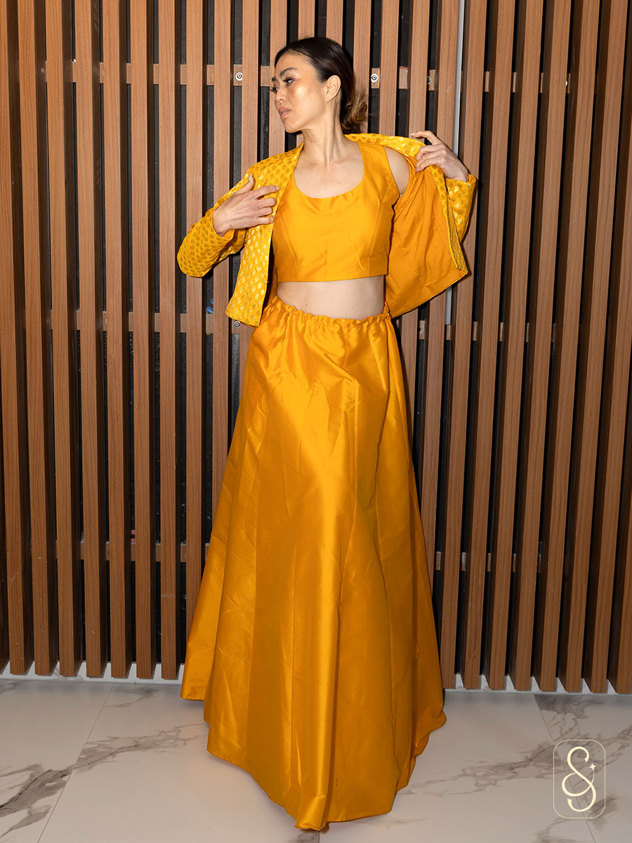 This vibrant yellow silk lehenga with a matching blouse is beautifully paired with a rich Banarasi jacket. The combination of bright silk and traditional weave creates a striking and elegant look. It is perfect for weddings, festive events, or cultural celebrations. The ensemble radiates timeless charm with a modern touch in every move.